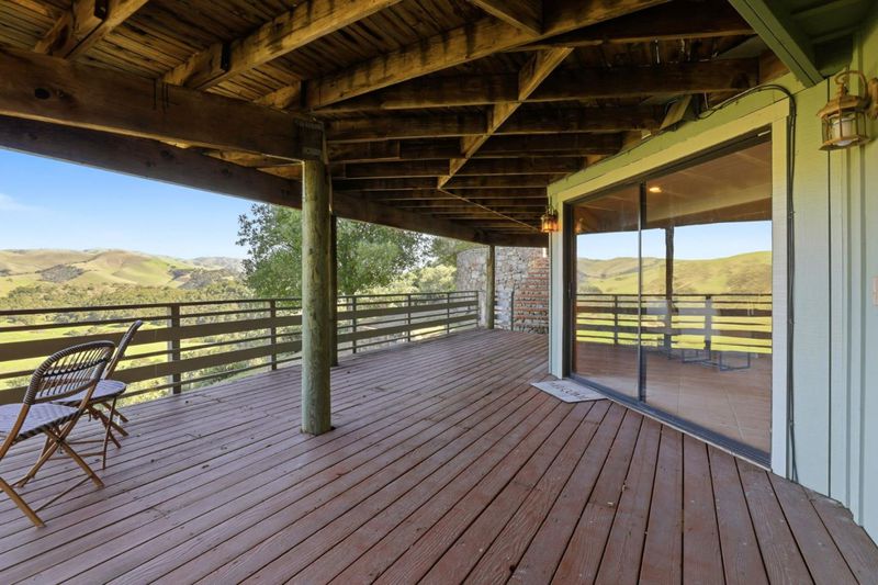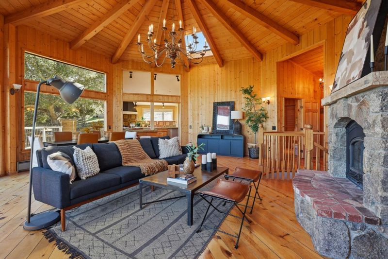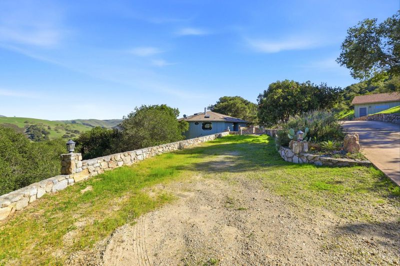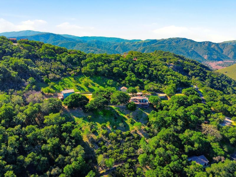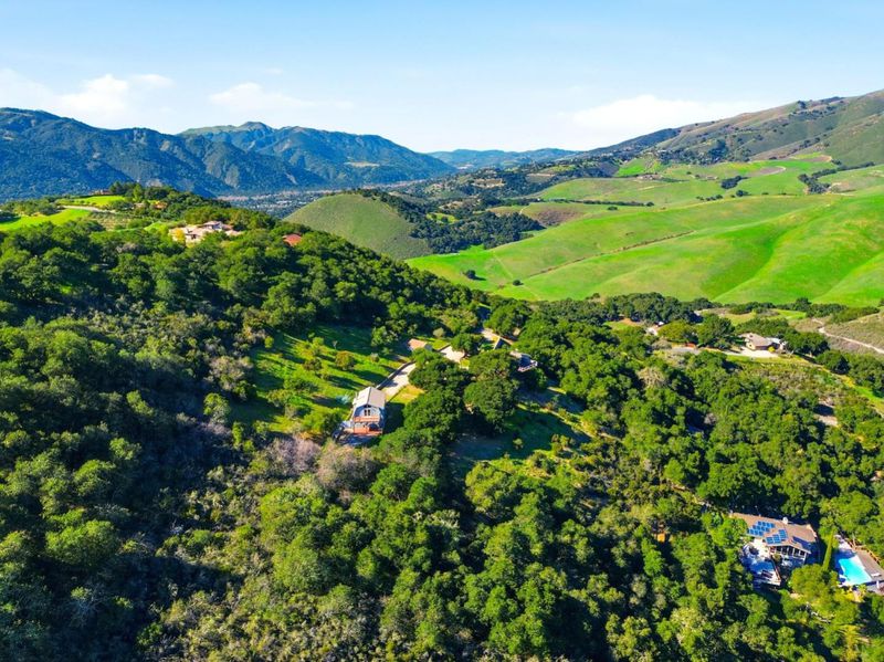 Nestled in the beautiful serene hills of Los Tulares, just minutes from Carmel Valley Village, is a unique private retreat. Enter via a curving stone-lined drive to arrive at a totally secluded oasis framed by statuesque oaks. Two distinct residences are connected by meandering stone paths, outdoor gathering areas, a peaceful waterfall and koi pond. The circular homes main floor features a warm, lodge-style living room with a wall of windows that bathe the space in natural light. A massive chandelier and stunning stone wood-burning fireplace add a cozy focal point, while the open kitchen and dining area make everyday living and entertaining effortless. Off this area, find the unique and comfortable primary suite, two full baths, and a flexible bonus room. Outside, a huge deck captures sweeping valley views of the prestigious "Village Ranches" and no neighbors, just lowing cattle. Downstairs, with access to the wine cellar, a separate lower-level suite offers its own kitchenette, bathroom, bedroom, living space, and separate deck with the same stunning view and easy access to both the front and rear of the property. Continuing further on the drive we find the separate two-story barn-style ADU with 1,484 sq. ft. of multi-purpose use, including 2 bedrooms, a bath, and kitchen.