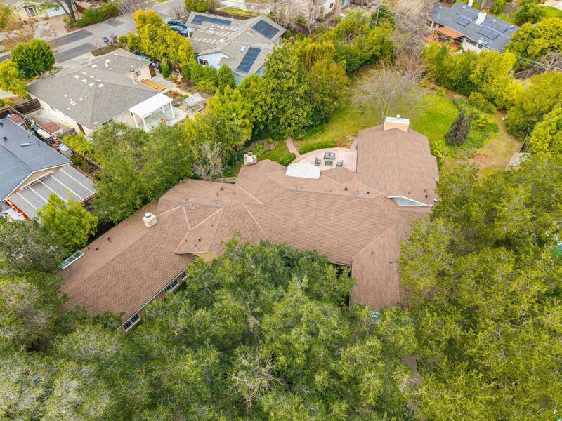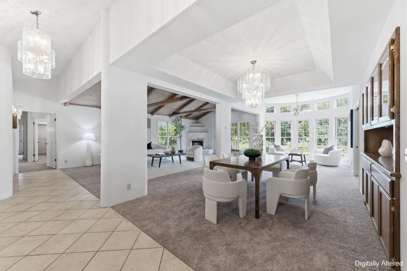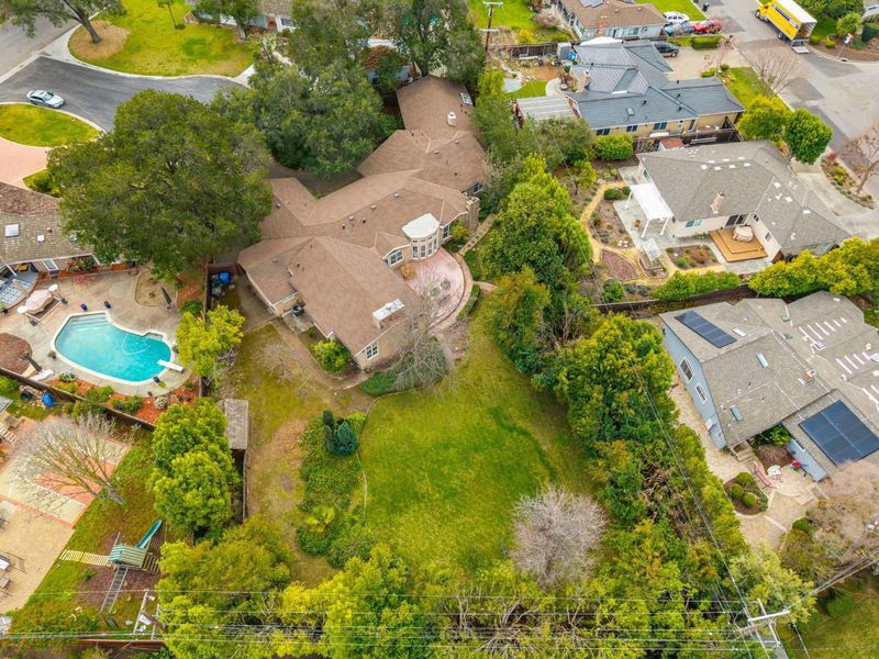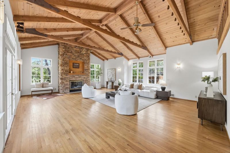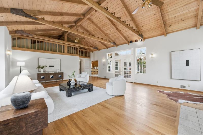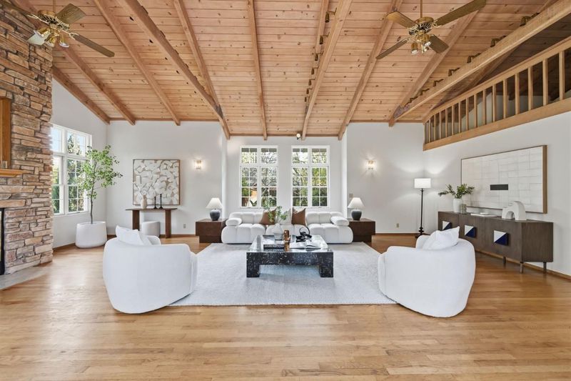 Tucked away on a quiet cul-de-sac, this SE-facing property sits on nearly half an acre with a circular driveway beneath a magnificent Western Live Oak. Inside, the expansive formal living room with soaring cathedral ceilings and exposed natural-wood trusses creates an inviting space. Sunlight pours in through a rear wall of windows, connecting the home to the deck and lush backyard. The formal dining room showcases a grand chandelier, coved ceiling, and built-in china cabinet with a pass-through to the kitchen. The large kitchen echoes the home's architectural character with vaulted wood-trussed ceilings, a casual dining area, breakfast bar, generous storage, and walk-in pantry. The grand family room, centered around a stone fireplace, opens to the backyard through French doors. This wing also includes dual closets, a full bath, a loft area, and garage access, making it ideal for extended family living or an ADU. The private bedroom wing offers four bedrooms, two en-suite, including an oversized primary retreat with a light-filled bath, dual sinks, soaking tub, walk-in closets, and an outdoor feel. A connected sitting room provides a relaxing private oasis for unwinding. A three-car garage (parking for 5 cars), storage shed, and expansive lot provide exceptional privacy.