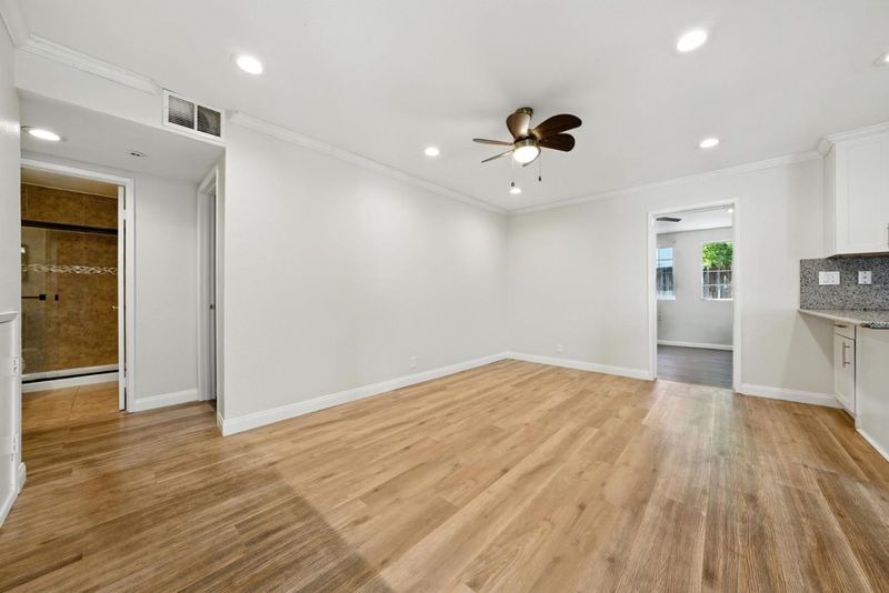 Welcome to this well-maintained 4-bedroom, 3-bathroom home located on a quiet cul-de-sac. The home offers a bright and functional floor plan with abundant natural light, vaulted ceilings, and generous storage throughout. Living spaces are well laid out for both everyday living and entertaining, with an open connection between the living areas and the kitchen, which features granite countertops. A bedroom and full bathroom on the main level provide added flexibility. Additional features include central heating and air conditioning, a cozy fireplace, and an attached two-car garage. The attached studio (permit status unknown) includes one additional bedroom and full bathroom, offering versatile use for extended family, guests, or a home office. The private backyard provides a comfortable outdoor retreat. Conveniently located within walking distance to elementary, middle, and high schools, nearby parks, and with easy access to shopping, dining, and major tech campuses.