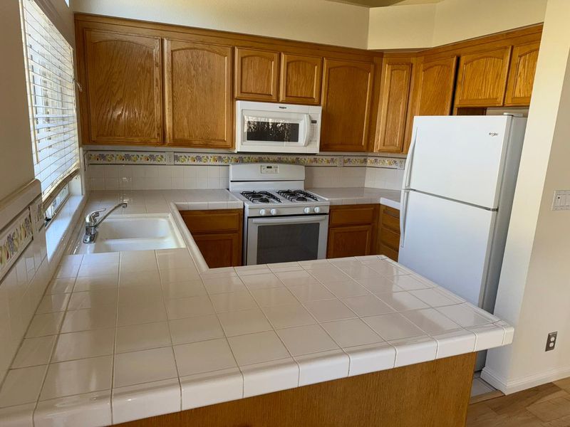 - Countertop - Tile, Dishwasher, Exhaust Fan, Garbage Disposal, Ice Maker, Microwave, Oven - Gas, Refrigerator
