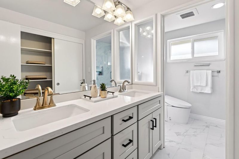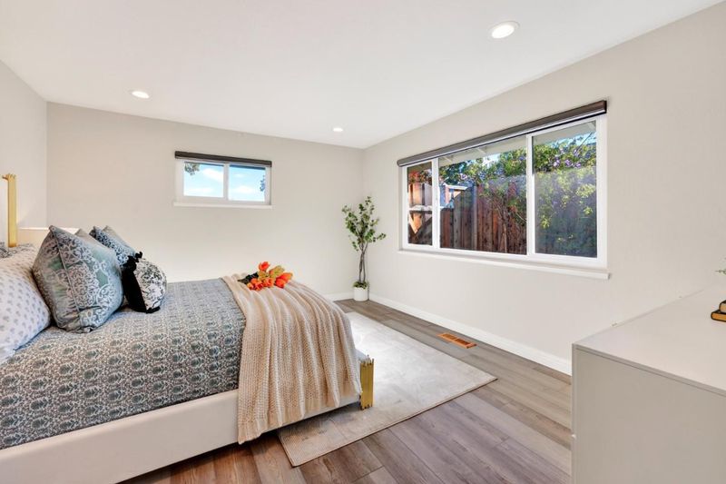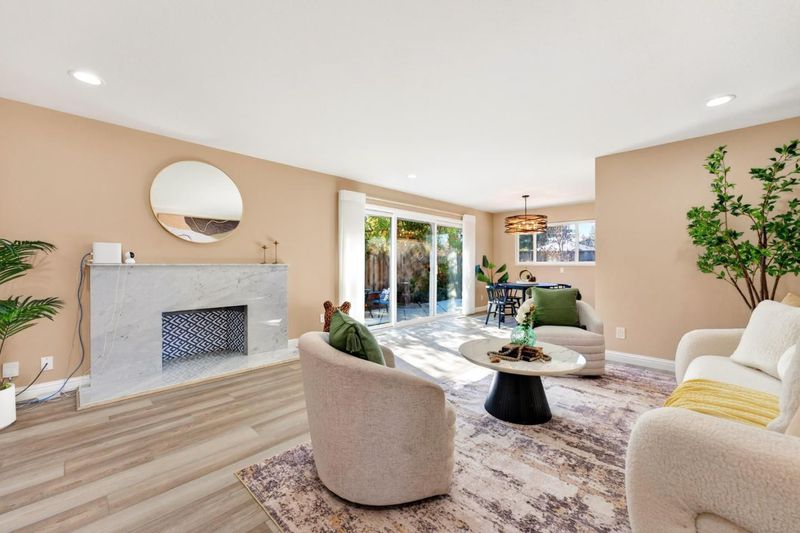 Discover this stunning 2,086 sq ft single-family home, perfectly situated in the heart of Sunnyvale. Built in 1956 and extensively remodeled, this 5-bedroom, 2-bathroom residence beautifully blends classic mid-century structure with sophisticated contemporary design. The open-concept living area features elegant wide-plank flooring and a marble fireplace that serves as a focal point for the light-filled room. A chef-inspired kitchen is a true showstopper, boasting sleek white cabinetry, a dramatic tile backsplash, and premium stainless steel appliances. Enjoy seamless entertaining in the expansive dining areas, which flow effortlessly through sliding doors to a private backyard retreat featuring a lush lawn, patio, and mature fruit trees. The primary suite offers a serene escape, while additional bedrooms provide flexible space for a home office. Updated bathrooms showcase modern vanities and high-end glass-enclosed showers with marble-style tiling. This move-in-ready home also includes a dedicated laundry room and a wide driveway with ample parking. Located in a prime Silicon Valley neighborhood, this property provides the perfect balance of style, comfort, and convenience.