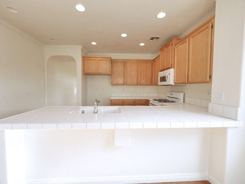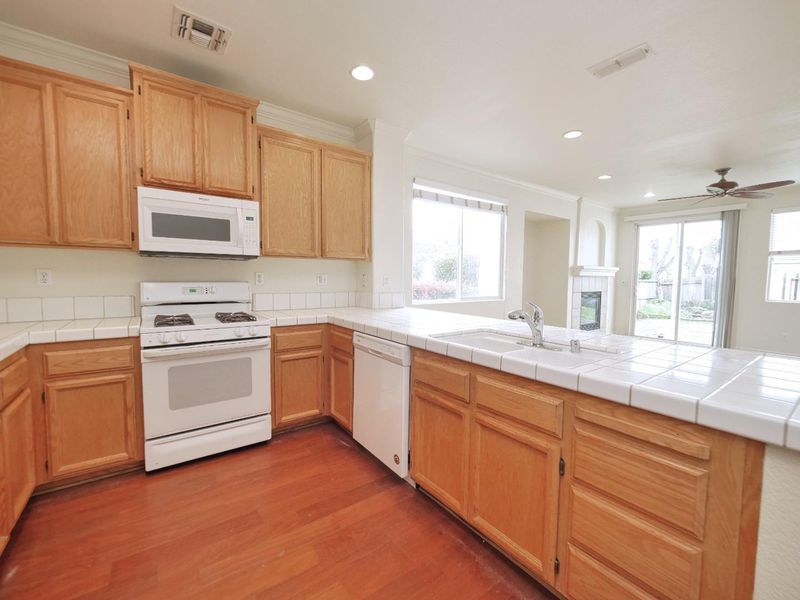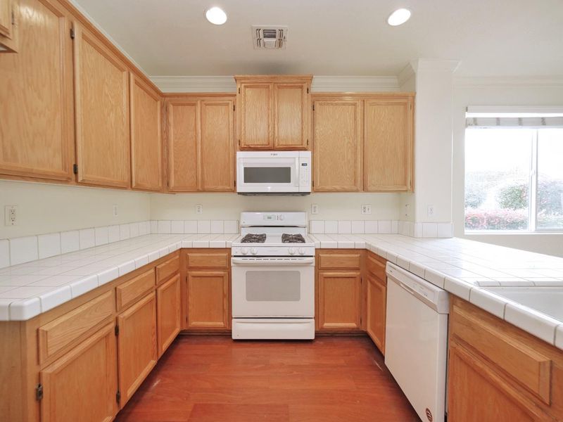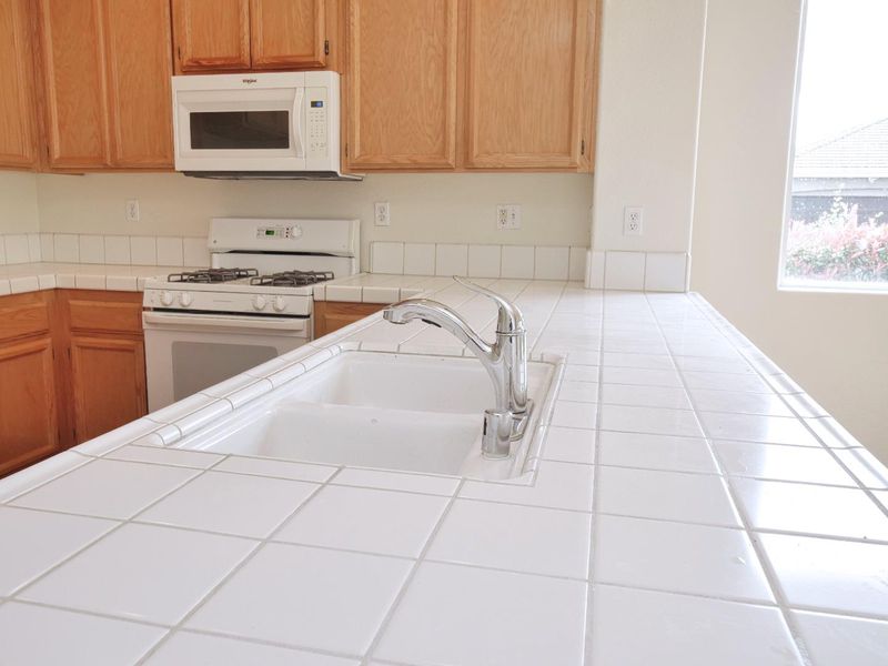 - Cooktop - Gas, Countertop - Tile, Dishwasher, Exhaust Fan, Garbage Disposal, Hood Over Range, Hookups - Ice Maker, Microwave, Oven - Built-In, Oven Range, Pantry