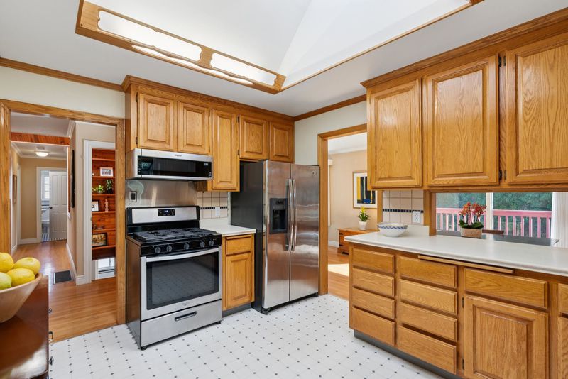 - Dishwasher, Gas Range, Microwave, Free-Standing Range, Refrigerator, Dryer, Washer, Counter - Solid Surface, Disposal, Gas Range/Cooktop, Pantry, Range/Oven Free Standing, Skylight(s), Updated Kitchen