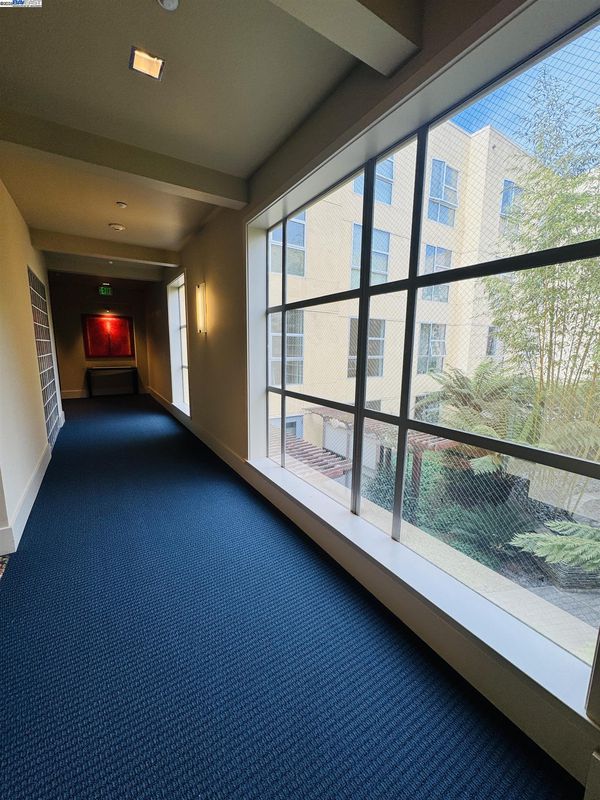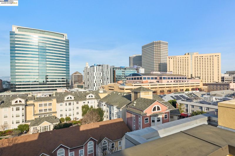 Welcome to Market Square, heart of Oakland's historic district! This stylish 1-bedroom, 1-bath condo features soaring 10-foot ceilings and an abundance of sunlight that floods the south-facing unit. This unit has brand new wood flooring and new interior paint. The building offers numerous amenities designed to enhance your lifestyle. Relax in the sauna and steam room, stay fit in the upscale gym, or catch up on work in the designated workspace and conference room. Adjacent to the gym is a serene garden area, ideal for coffee and lunch breaks. For those who love to entertain, the rooftop deck awaits! Equipped with a barbecue, it offers panoramic views of downtown Oakland, the bay, and even glimpses of San Francisco's iconic skyline. The condo's kitchen boasts granite countertops and stainless steel appliances, inspiring your inner chef. After a long day, retreat to the tranquil bedroom with a generous walk-in closet, ensuring ample storage for your wardrobe essentials. Additional conveniences include a large coat closet and in-unit washer and dryer. Enjoy convenient access to nearby Lake Merritt, downtown Oakland, Jack London Square, several BART stations and the jewel of Oakland...Lake Merritt.