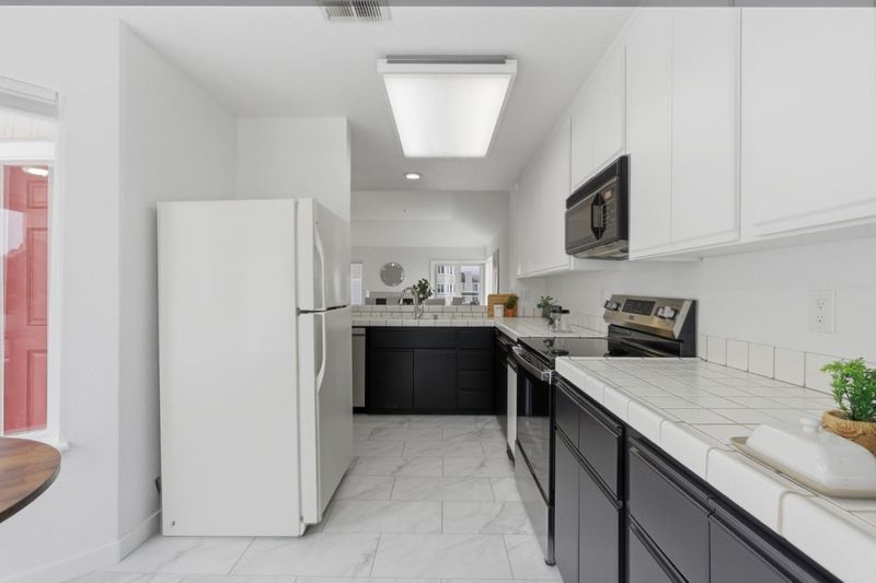 - Countertop - Tile, Dishwasher, Hood Over Range, Microwave, Oven Range - Electric, Refrigerator