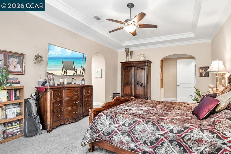 Stunning Italian Tuscany Rafael Model – Many Upgrades - Welcome to this exceptional 2-BR plus an office (or 3rd bed), 2.5-bth, 2,751 sq ft home, 2.5 car garage. A 55 & over gated community, “Trilogy at the Vineyards”. Front door entry filled w/ vines & succulents. Formal dining rm w/custom chandelier, custom window treatments throughout. Large family room, high ceilings, custom flooring throughout. Kitchen-granite counters, cherry cabinets w pullouts, Jenn-Air appliances double ovens, microwave, dishwasher, wine cooler, gas stove, & plus dinette area. The Harth Room - gas fireplace, a brick-accent wall & views of the hills. Possible 3rd BR is currently her & his private room & office. Primary suite - coffered ceiling, French doors & the large walk-in closet. Primary bath - shower stall, his & her vanity, a large tub w/ view of the hills. 2nd BR suite with bathroom. Hallway - guest bath, Cherry wood cabinets & granite tops. Laundry rm - sink & cabinets. A fabulous backyard - 2 custom patios & patio covers, fans, decorative lights & waterfall features. Views of the sunset. Tesla SOLAR, 220 EV charging station, tankless water heater, epoxy garage floor & storage cabinets. The Club house has a restaurant, a spa, gym, 2 pools, tennis, pickle ball, bocce & endless social activities.