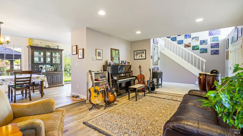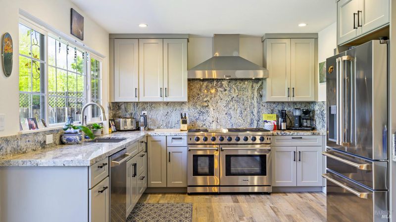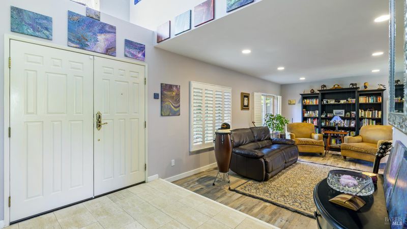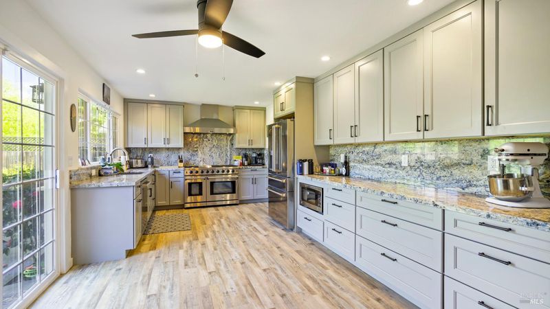 This gorgeous golf-course adjacent Rohnert Park home is sure to delight! Enjoy the shady front yard with mature trees and lush garden. Just inside is the bright entry with sky-high ceiling, tile, and easy access to the living room with recessed lighting, plantation shutter windows, and luxurious flooring. The dining area is open to the remodeled kitchen, complete with stainless steel appliances, Thor gas range and hood, granite counters and backsplash, recessed lighting, ceiling fan, and a window that lets you take in your entire backyard and hillside views. The cozy family room includes a large backyard slider and brick fireplace. The rest of the main level includes a bedroom and gorgeous full bath + den. Upstairs holds 3 guest bedrooms, an office space perfect for an additional guest bed, full bath, and the primary suite. Here you'll love the vaulted ceiling, large glass mirror closet, shutter windows, bright sitting area, and the full bath with granite countertop. Your backyard paradise consists of a spacious patio with gazebo, lawn, perimeter garden space, privacy fences, rock water feature, and a lot that backs up to currently open fields for optimal peace and views. Other wonderful features include the tankless water heater, nearby shopping and dining, easy commuter access, and a quick trip to Sonoma State University and the renowned Green Music Center!