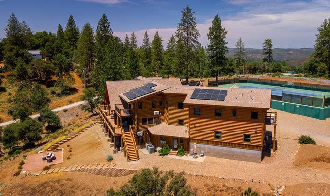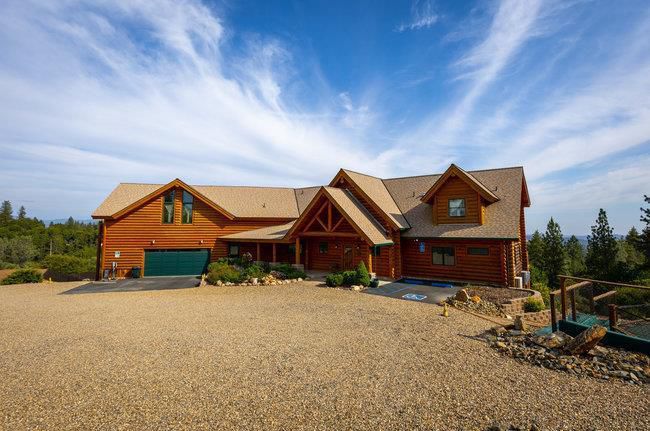 Extraordinary opportunity awaits buyers seeking a private estate, luxury vacation rental, duplex, or boutique inn conversion. This architectural masterpiece offers over 8,000 sq. ft. of breathtaking log construction on 5 scenic hilltop acres in Murphys, ideally situated between Lake Tahoe and Yosemite. Originally designed and built as an award-winning Bed & Breakfast by renowned Bay Area tennis professionals, this meticulously maintained property blends rustic elegance with modern infrastructure. The estate features: guest suites with ensuite baths, professional-grade commercial kitchen, dramatic 23-foot Great Room with a 10' stone fireplace & wet bar, Loft/Library, game room, Office/Den, oversized laundry room, massage room, private apartment w/separate entrance and second kitchen. Outdoor highlights include: Two regulation-size tennis courts, Dual EV chargers, Tesla Powerwalls, Generac backup generator, Two central A/C units plus eight mini-splits, Quadruple water filtration system, on-site well servicing gardens and filtered water supply, drought-tolerant professional landscaping. Enjoy sweeping 360° panoramic views from this commanding hilltop setting. A rare opportunity to own the real estate not the business and reimagine this exceptional property to suit your vision.