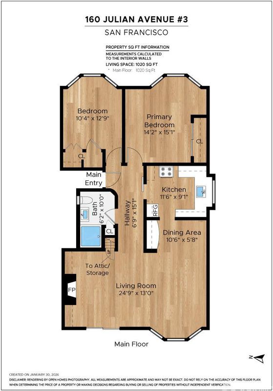 Welcome to 160 Julian Street No. 3 - a top-floor residence in the heart of the Mission District offering remarkable character and exciting potential. This exceptional two-bedroom, one-bath condominium presents a thoughtfully updated interior with wide-plank 8 engineered French oak flooring, new windows and doors, contemporary light fixtures, and fresh paint throughout. The existing bathroom has been tastefully updated, and the open layout allows future owners flexibility to enhance or redesign living spaces to suit personal style. An exclusive-use attic provides generous storage options or the possibility for creative use, while a private deck off the living room and access to a sunny shared yard extend your living space outdoors - ideal for al fresco dining or relaxation. Additional features include a wood-burning fireplace and keyless unit entry. One deeded parking pad is accessed via Caledonia Alley, which is celebrated for its vibrant Mission District murals by acclaimed local artists. Situated in one of San Francisco's most dynamic neighborhoods, this home is just steps from the iconic restaurants and shops along Valencia Street and the 16th Street BART station. The location boasts Walk Score 99, Bike Score 100, and Transit Score 100, making daily errands, biking, and transit access easy. An outstanding opportunity to own a distinctive home in a lively urban setting with the canvas to personalize.