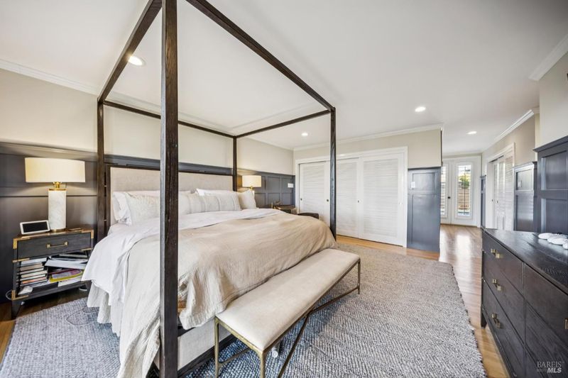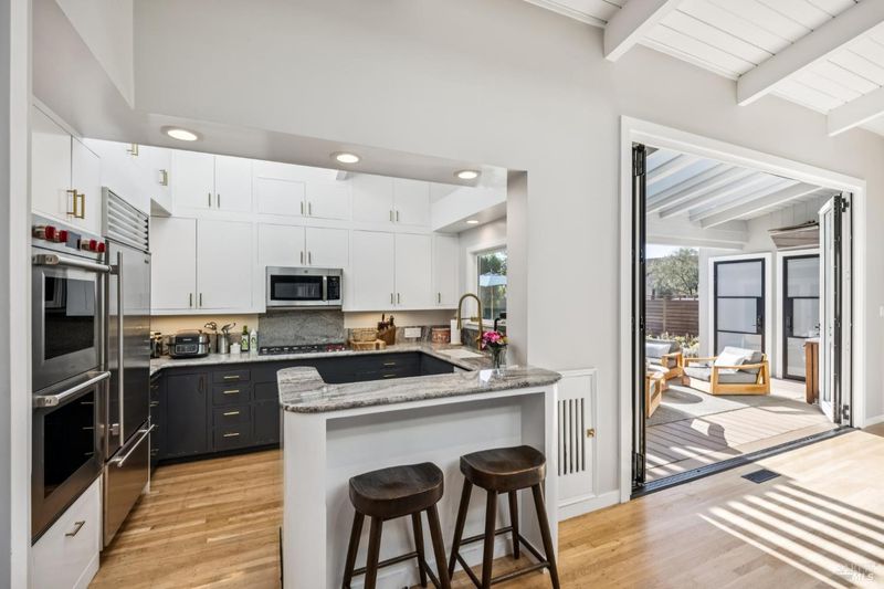 This beautifully renovated home offers the exceptionally rare combination of single-level living atop Belvedere Island, with spectacular views and seamless indoor/outdoor flow on a wide, flat cul-de-sac street. The sun-drenched living room features a dramatic 12.5 foot vaulted ceiling and a large folding NanaWall that opens to a show-stopping entertaining deck complete with an outdoor Hestan kitchen, heated dining area, two lawns, and an additional connected patio with fire pit, overhead heaters, and a disappearing TV. The kitchen and dining area open to the private front yard through a second NanaWall, creating a true resort-style setting with a covered, heated patio, saltwater pool, and outdoor shower. The bedroom wing includes a gracious primary suite with a luxurious spa-like bath, built-in closets, and private access to both the backyard and the pool deck. Three additional bedrooms share a spacious hall bath. The home and grounds were fully updated and modernized in 2023 with high-end materials, custom woodworking, and refined luxury finishes throughout.