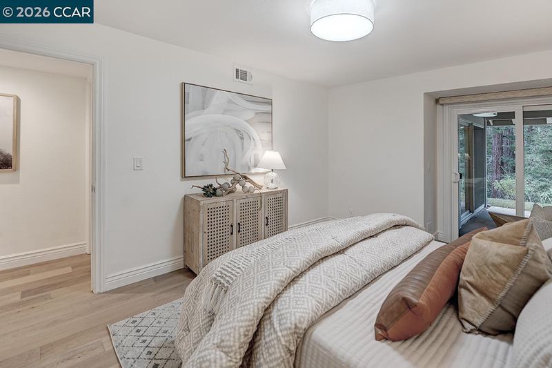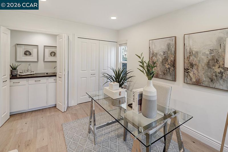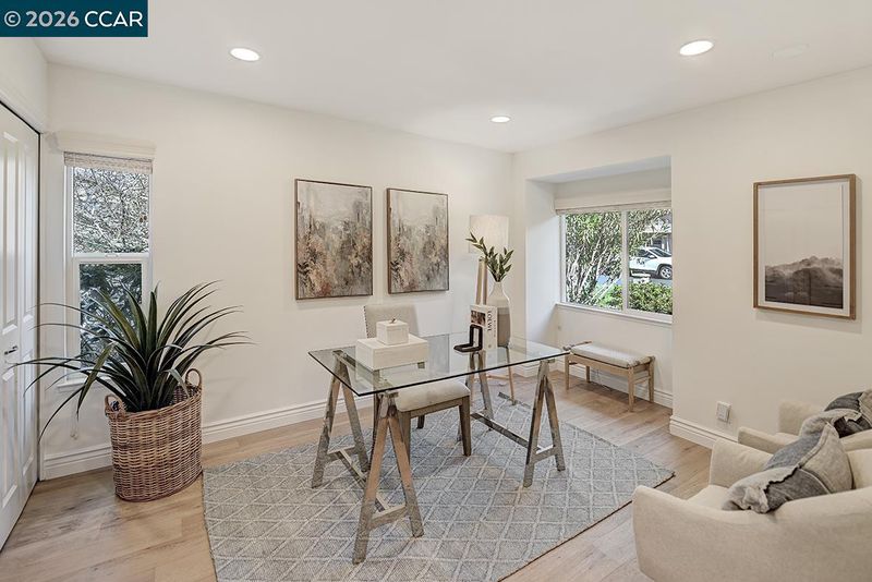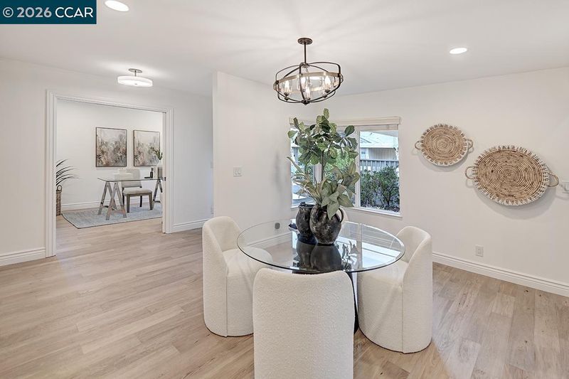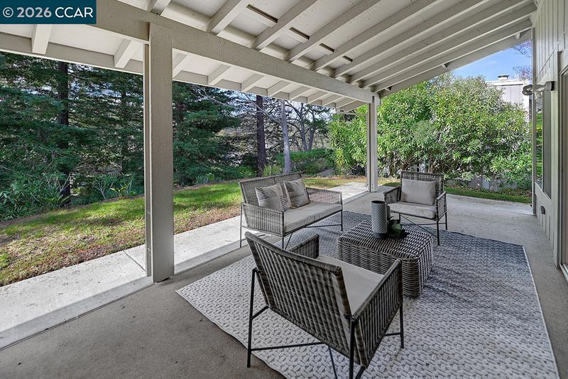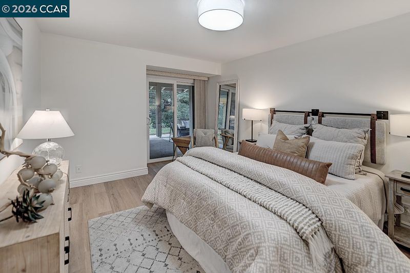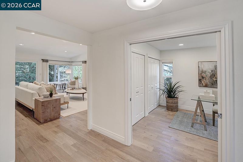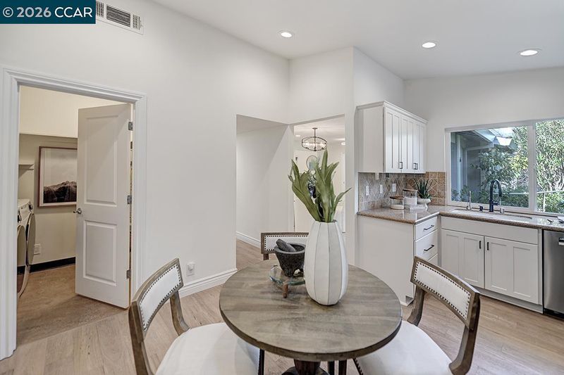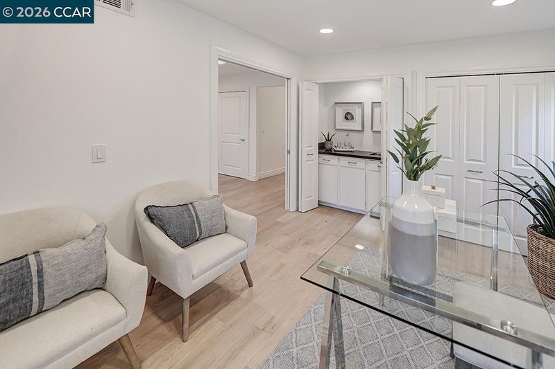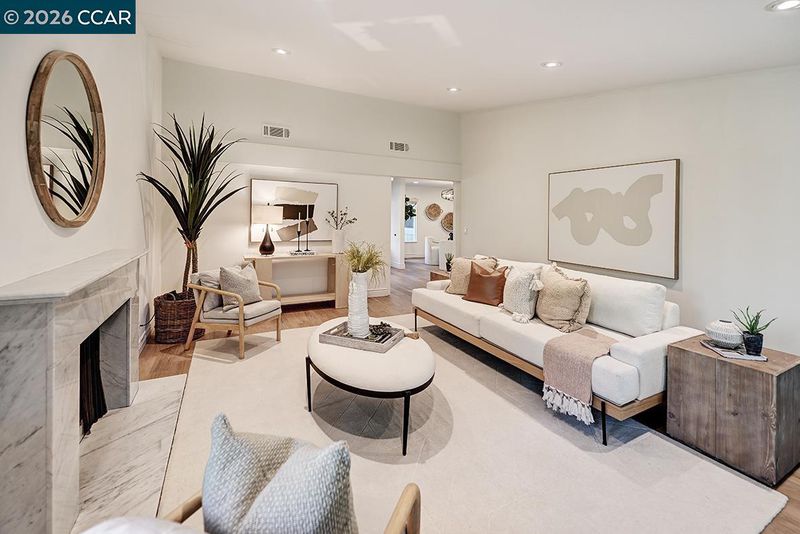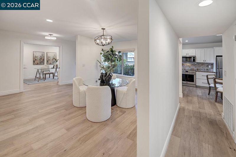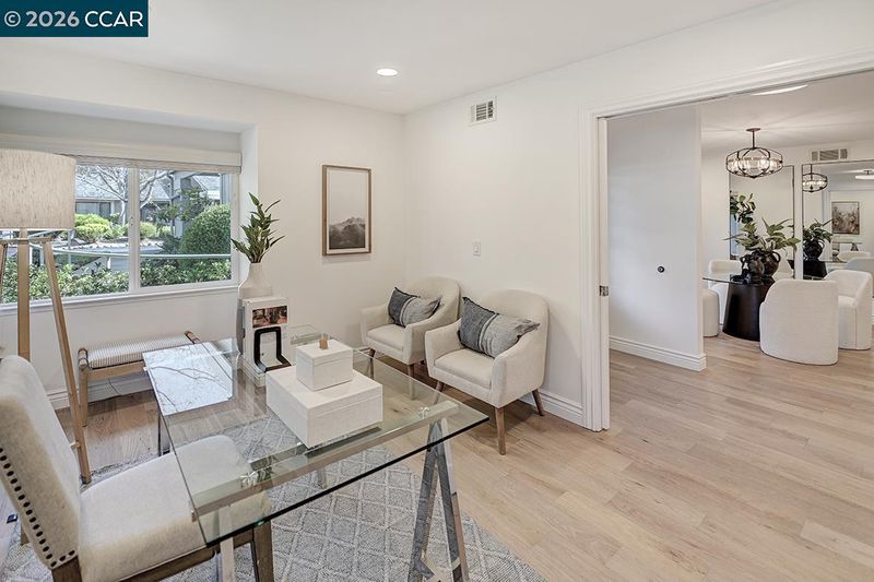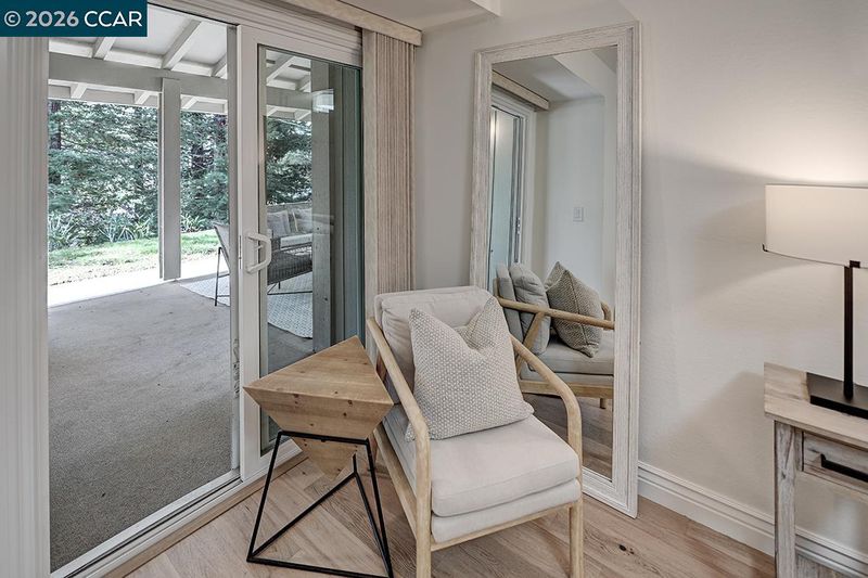 Spectacular LEVEL IN single story, end unit Whitney! Lights galore, recently added MANY overhead lights in the Garage, Kitchen, Dining Room, Living Room and Primary Bedroom. A spacious grand Living Room features a stone fireplace and provides access to a private, extremely wooded quiet back patio. Cozy Den or 3rd bedroom located near the entrance with double doors for privacy. The kitchen shines with white cabinets and black handles, stainless steel appliances, an oversized skylight, room for a table and chairs afford in room dining. Radiant floors in the Primary Bathroom with a curb-less walk in shower. Solar tubes in the bathrooms for natural light, a separate room for an interior washer/dryer and engineered hardwood floors throughout. Attached garage with adjacent carport. Highly desirable area, close to Rossmoor's Event Center, Dollar Clubhouse, the New Rossmoor restaurant and two well maintained golf courses.