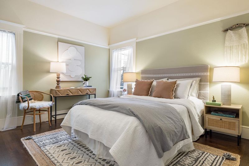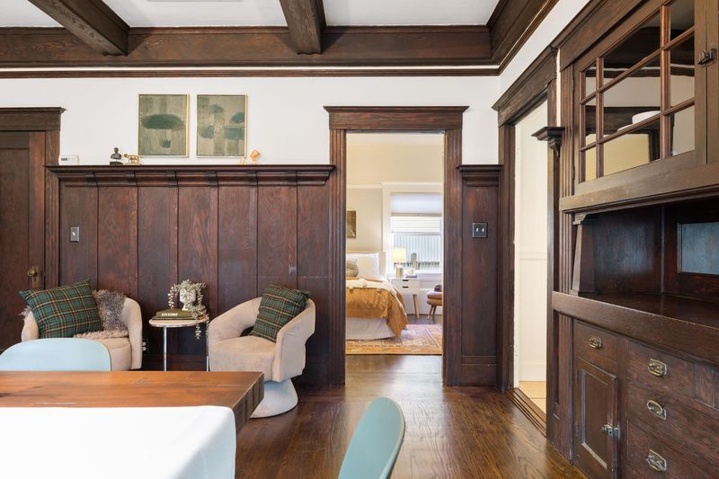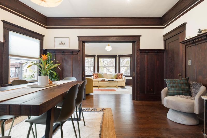 Timeless Beauty: Craftsman Home, Idyllic Street This 3-bedroom, 1-bathroom residence retains the built-in charm of an early 20th century Craftsman, featuring original wood floors, large rooms, a big kitchen, and a large front porch. Some of the beautiful details of this home are the well-designed built-ins, such as the buffet in the dining room, a bookcase in the living room, and pocket doors between the two main areas. Other well-loved features include the stained glass windows above the built-in bookshelves and the leaded glass window in the foyer, along with the extra-wide front door with a sliver of a moon window embedded within. Along with the charm of this home are the modern conveniences of solar panels, upgraded electricity and plumbing. The office and large family room/bedroom were added in the 1960s. Located on a tree-lined street, the property offers a private retreat with fruit trees, raised garden beds, and a sweet sitting area in the backyard.