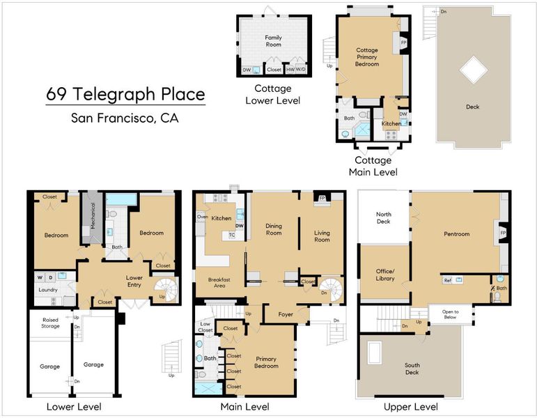 Incredibly live-work opportunity! Plenty of room to run your company, host guests and also live, enjoying the fabulous views and decks in these two adjacent, detached homes on a cul-de-sac on Telegraph Hill . The main home offers a dining room with Bay views, a den with fireplace, an updated view kitchen with deluxe appliances, pantry and a breakfast area. The primary suite boasts 4 closets and an ensuite bath. Upstairs is a spectacular family/living room with fireplace and a walk-out deck with Bay and Alcatraz views along with a view office, and a sunny, south-facing deck. On the lower level are 2 bedrooms, an attractive bath with shower, laundry room, wine storage, and a 2-car garage. 339 Lombard Street presents an inviting studio, complete with a built-in Murphy bed, gas fireplace, full kitchen, and a renovated bath with shower. Downstairs is a multi-use room with laundry and a wet bar, opening to a serene brick garden with a cascading fountain. Upstairs showcases an expansive landscaped roof terrace, featuring sweeping Bay views. Whether paired as a main residence with a guest cottage, or a multi-generational living opportunity or studio workspace, this is a rare gem in San Francisco's most iconic neighborhood.