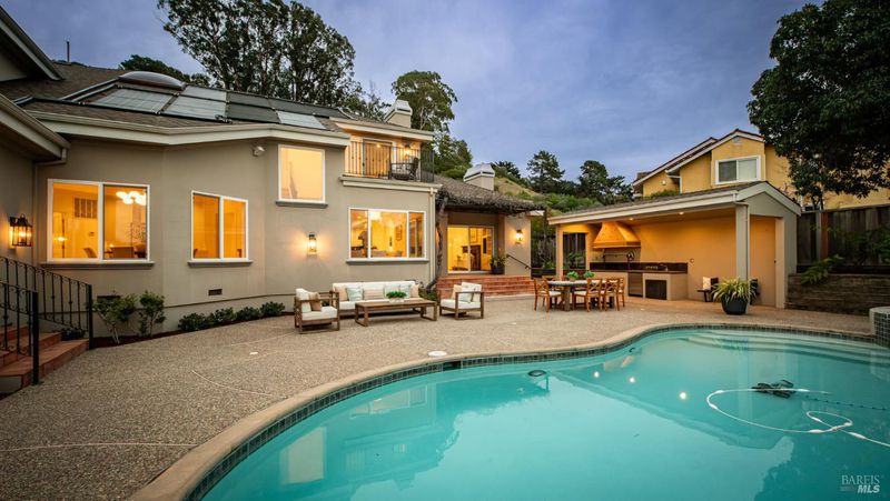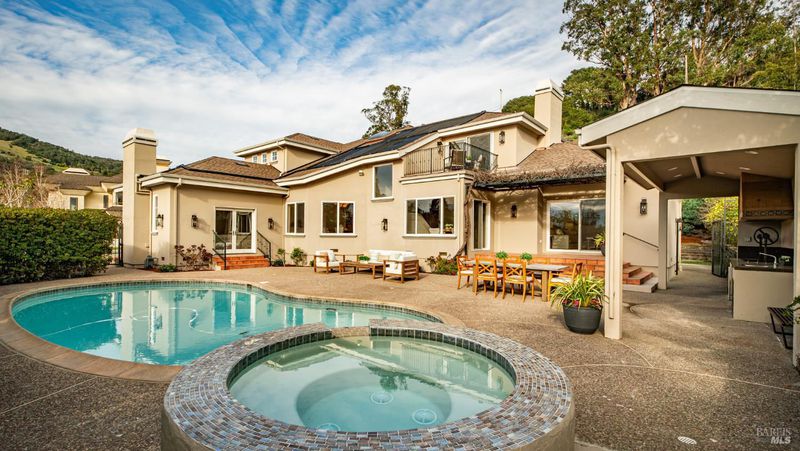 Situated in a private, gated setting in desirable Seastrand, this extraordinary residence offers an elevated lifestyle defined by space, sophistication, and effortless indoor-outdoor living. Enjoy a resort-style pool, tranquil privacy, and dramatic Mt. Tam view - all in a prime, sought-after location. Volume ceilings and an abundance of natural light greet you as you enter this stunning home. The exceptional layout offers a large formal living room with a fireplace and access to the pool area. The stylish, formal dining room accommodates intimate dining or larger gatherings. A large chef's kitchen with a center island, 6-burner gas range, breakfast area, and ample storage, adjoins the spacious family room with a fireplace and access to both the front and backyards for easy outdoor living and entertaining. A large bedroom, bath, powder room, and laundry room complete the main level. The upper level offers an elegant primary bedroom suite, which features an updated bath and a private balcony with a stunning Mt. Tam view. Two additional Jack and Jill bedroom suites are also located on this level. A spacious 3-car garage provides an additional storage area. Designed for indoor/outdoor living, the .28-acre lot features a private wrap-around yard with solar-heated pool, spa, outdoor barbecue, and entertaining areas. The premier location blends tranquility with proximity to vibrant downtown San Rafael, popular Andy's market and marina, hiking and biking trails, McNear's Beach, and China Camp State Park. An exceptional offering in a coveted setting.