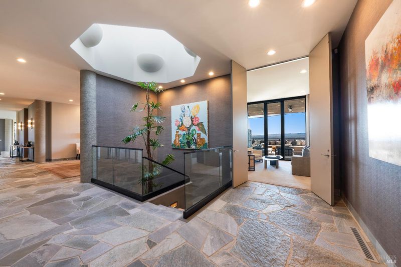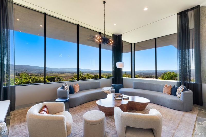 Designed for five-star resort living, this private, serene vineyard Estate includes an infinity-edge pool with dual baja shelves and spa, a full gym, sports court, new tennis court, putting green, fire pit, gourmet outdoor kitchen, large TVs, overhead heaters, and mesmerizing views. Easily venture out to Yountville, St. Helena, and downtown Napa or out for a round of golf at the Silverado PGA golf course just down the road. Perched atop 43.78 private acres, this 11,000 sq ft 5 bedroom, 4.5 baths breathtaking Napa Valley estate offers unparalleled 360-degree views. Built in the style of Frank Lloyd Wright, the residence showcases exquisite masonry with native stone, blending beauty, comfort, and sophistication. Each space is intentionally crafted, from the expansive living room with a custom bar and fireplace to the state-of-the-art media room, wine cellar, and game-ready billiards room. The newly remodeled kitchen opens to a welcoming family room and covered BBQ terrace, and the formal dining room which comfortably seats 16 guests. The primary suite acts as a sanctuary, featuring a spa bath, sitting room, and private terrace. Concierge, chef and driver services included.