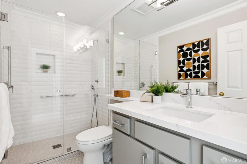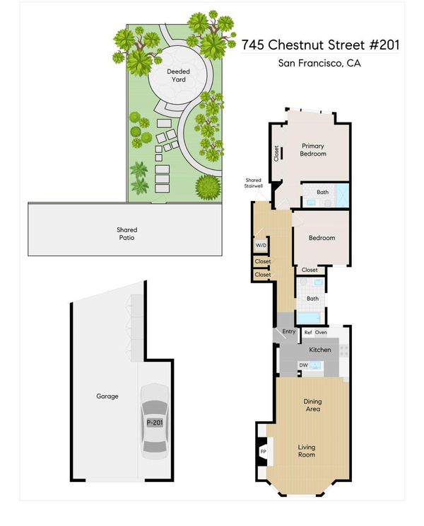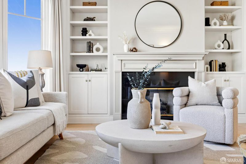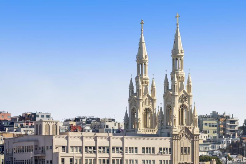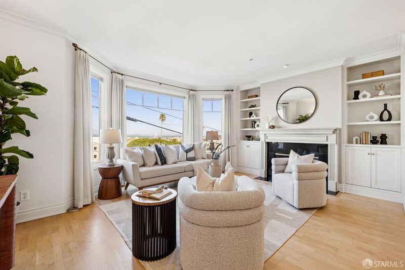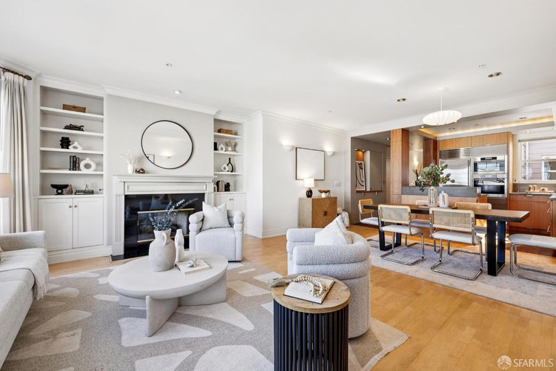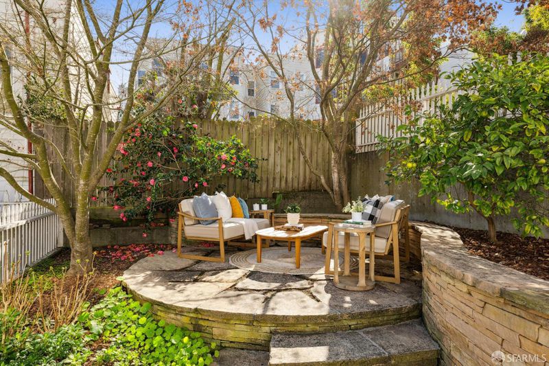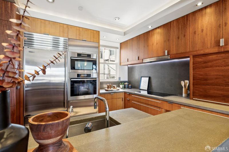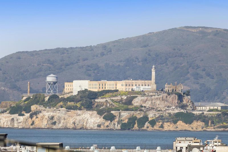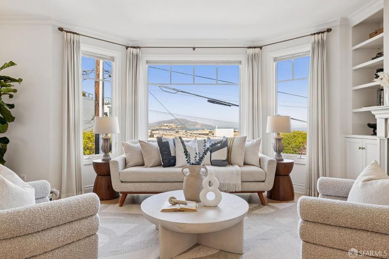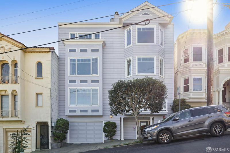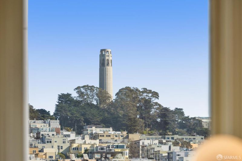 Enjoy stunning Bay & Alcatraz views from this thoughtfully designed condo at the crossroads of Russian Hill & North Beach. Half a block up from Columbus Avenue in a six-unit elevator building built in 1995, the home offers iconic views and a notably quiet interior, enhanced by large double-pane windows throughout. The open living, dining, and kitchen areas are anchored by a beautifully executed mid-century modern kitchen with warm wood cabinetry, concrete countertops, custom built-ins, Sub-Zero and Miele appliances, and dual dishwasher drawers. A fireplace highlights the living room with traditional trim detail, where bay windows frame views of the Bay and Alcatraz. Down the hall, a well-appointed bedroom is served by a full bathroom, with multiple hallway closets and a conveniently located in-unit washer and dryer. The south-facing primary suite overlooks the private yard and offers a quiet retreat with dual closets, a newly renovated en-suite bathroom, and cityscape views, including Coit Tower. Additional amenities include one garage parking space with an EV charger outlet, storage, Lutron lighting system, radiant-floor heating, a rare and large deeded yard, and elevator access. Ideally located near some of San Francisco's most celebrated neighborhoods, offering endless dining and shopping, with convenient access to the Financial District, Highway 101, and the waterfront. Walk Score: 99
