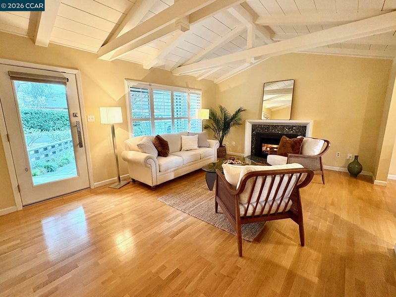 This home is a calm botanical oasis where you can sit poolside and enjoy nature. Relax in a serene garden with professionally designed landscaping for both beauty and easy maintenance. Featuring three comfortable bedrooms and custom closet organizers. The updated bathroom includes new fixtures, lighting and heated towel rack- a little luxury for those chilly mornings. The bright living room boasts vaulted wood beam ceilings marble gas fireplace and dining room that opens directly to the yard through dual French doors. Original hardwood floors, new designer paint and plantation shutters throughout. Located in the Orchard Glen neighborhood of Walnut Creek. Just a short walk to top-rated schools, local parks, hiking trails. Larkey Swim Club, shopping and dining at Palos Verdes Mall, Lunardi’s, Market on Larkey, Larkey Park, famous for its community vibe and splash pad, and so much more!