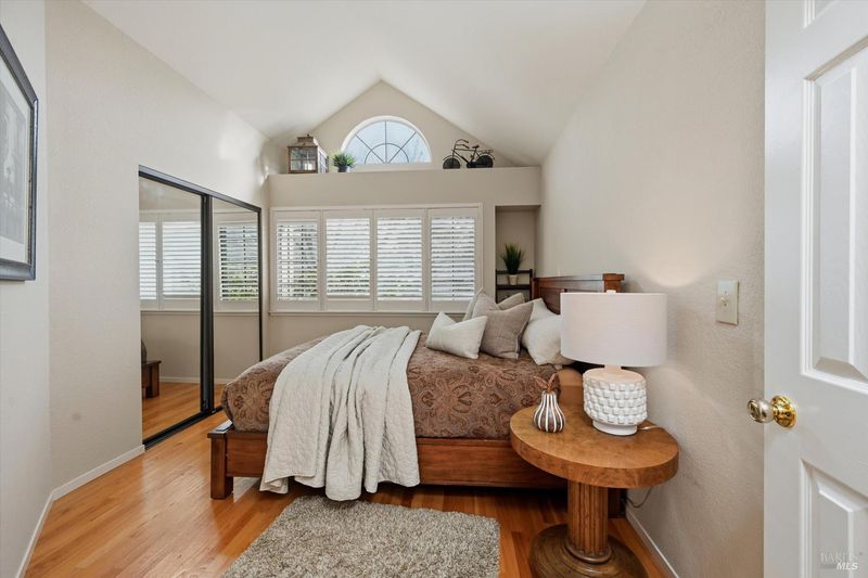 Beautiful single-level and centrally located Napa condo, close to shopping, parks, and downtown. You'll love the spacious and open living and dining area with its high vaulted ceiling, fireplace, and large windows. The hardwood floors extend throughout, and the kitchen includes a gas range, an abundance of cabinets and a pantry, greenhouse window, and breakfast dining area. From the living room, a sliding glass door leads out to an amazing patio where you could entertain quite the crowd. The primary suite also has vaulted ceilings, and the bath features a double vanity, skylights, walk-in closet, and large walk-in glass wall shower. Truly a sweet setup: a beautiful place to live, maintenance that's a breeze, and a home that's affordable!