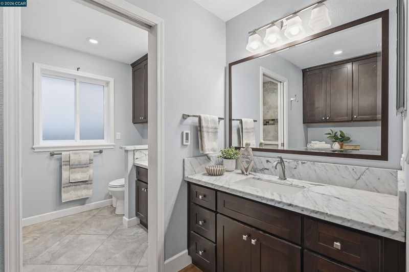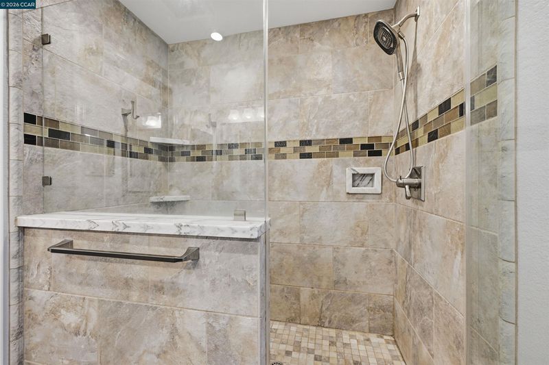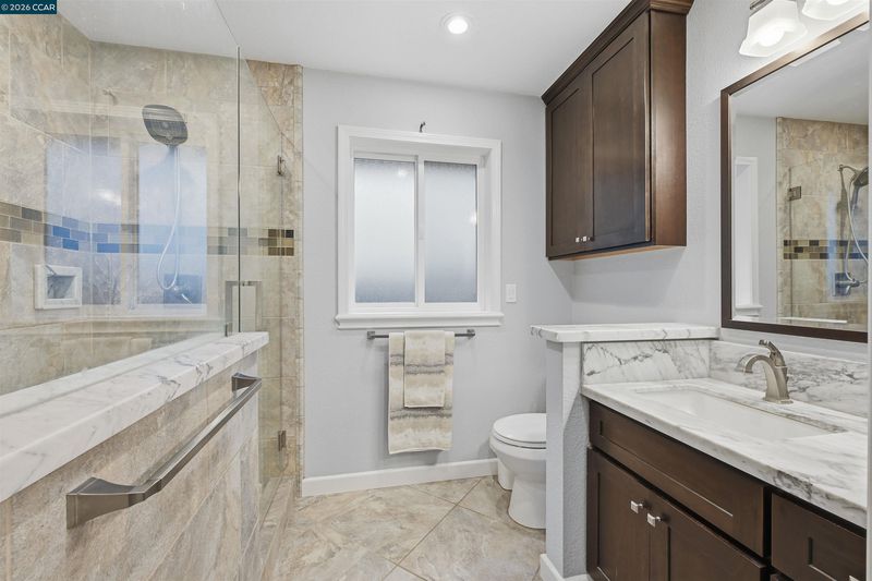 - Solid Surface, Stall Shower, Tile, Tub, Updated Baths, Double Vanity, Stone, Window