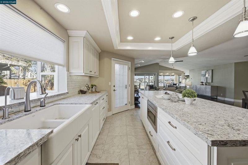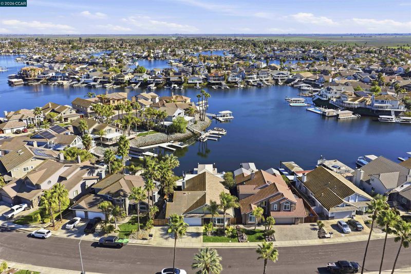 Beautifully remodeled single story waterfront home with stunning water views, sought after eastern exposure, a 3 car garage and side yard access. Spacious open floor plan features massive great room with vaulted ceilings. Remodeled chef’s kitchen features stone counters, high end appliances, and a large island with bar seating. Spacious primary suite features vaulted ceilings, gorgeous water views and sliding glass door to covered deck. Spa-like primary bathroom features a large walk-in shower. Huge laundry room. Gorgeous covered deck with ceiling fans. Oversized U-shaped vinyl dock has room for all your water toys!. Tons of storage space. Perfect for indoor/outdoor living and entertaining. Access to over a thousand miles of delta waterways from your backyard!