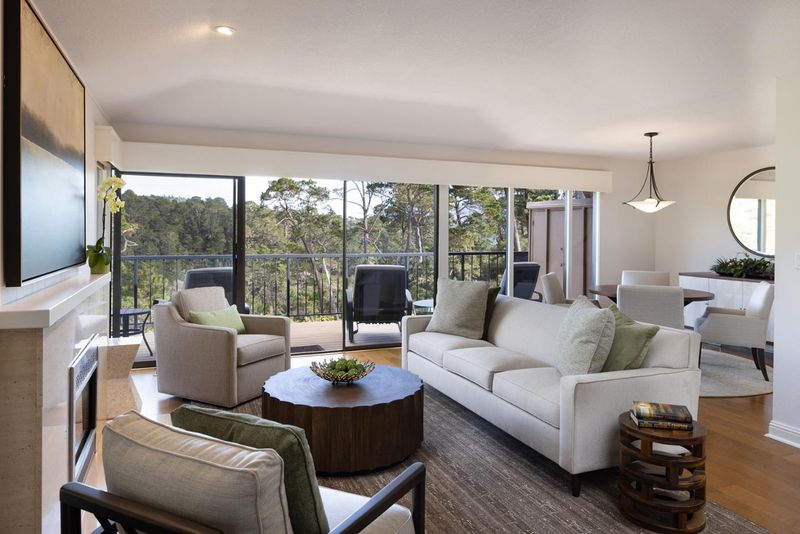 This F-model residence captures everything desirable about Del Mesa Carmel living. The home delivers true privacy while keeping you wonderfully connected to community life. The Club House, Woody's restaurant, fitness center, and upcoming hair and nail salon are all within an easy walk. Inside, natural light floods the open floor plan, highlighting birch hardwood floors and coffered ceilings. The real showstopper are floor-to-ceiling windows showcasing unspoiled forest hills. A living canvas that changes with every season. Step onto your private deck and you've entered another world entirely. Watch clouds drift across open sky, and breathe in the peace of undisturbed nature. Inside a welcoming fireplace anchors the living space and electric-powered window treatments frame views that never get old. This isn't just about the home itself it's about the lifestyle. Del Mesa Carmel has earned its reputation as an award-winning community where neighbors become friends, where world-class amenities complement natural beauty, and where security and comfort come standard. Practical highlights include in-unit washer/dryer, extra attic storage, and a level walk to your covered carport. Here, you get the best of both worlds: a tranquil, private setting paired with vibrant community connection.