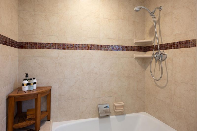 - Shower over Tub - 1, Granite, Stall Shower, Shower and Tub, Skylight, Tile, Tub in Primary Bedroom, Stone, Full on Ground Floor