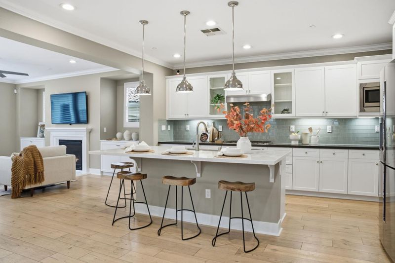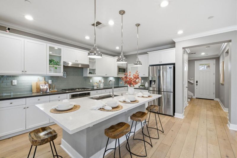 - Cooktop - Gas, Countertop - Quartz, Island with Sink, Microwave, Oven Range - Built-In, Gas, Pantry, Refrigerator