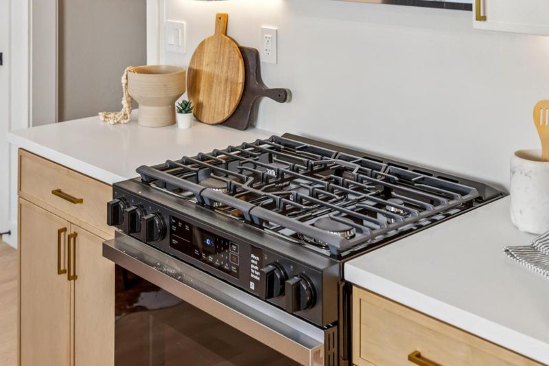 - Countertop - Quartz, Dishwasher, Exhaust Fan, Garbage Disposal, Hood Over Range, Hookups - Gas, Oven Range - Gas, Refrigerator
