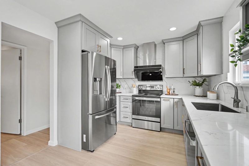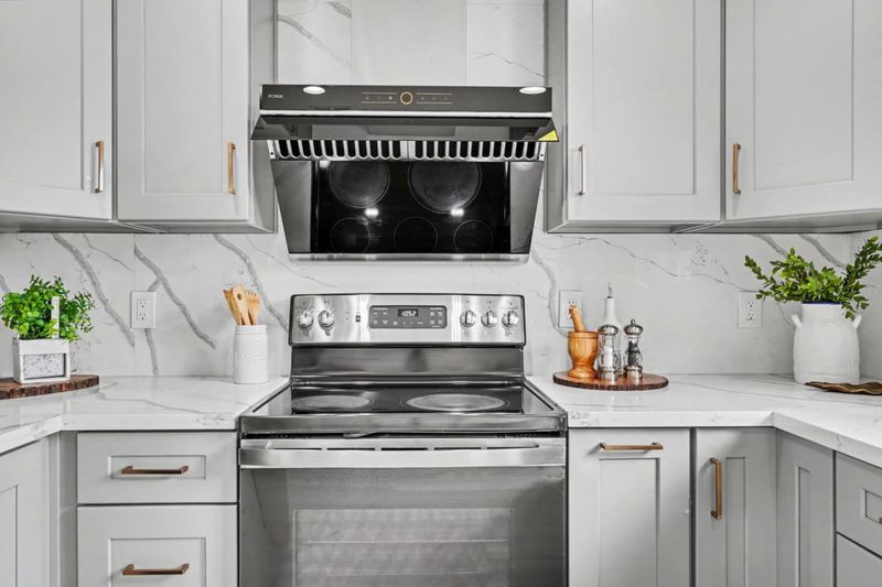 - 220 Volt Outlet, Countertop - Quartz, Dishwasher, Exhaust Fan, Garbage Disposal, Hood Over Range, Oven Range - Electric, Refrigerator