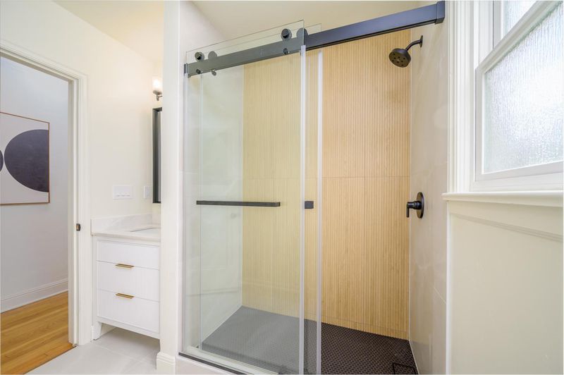 - Shower and Tub, Skylight, Stall Shower, Tile, Updated Bath