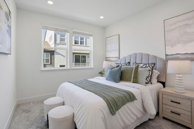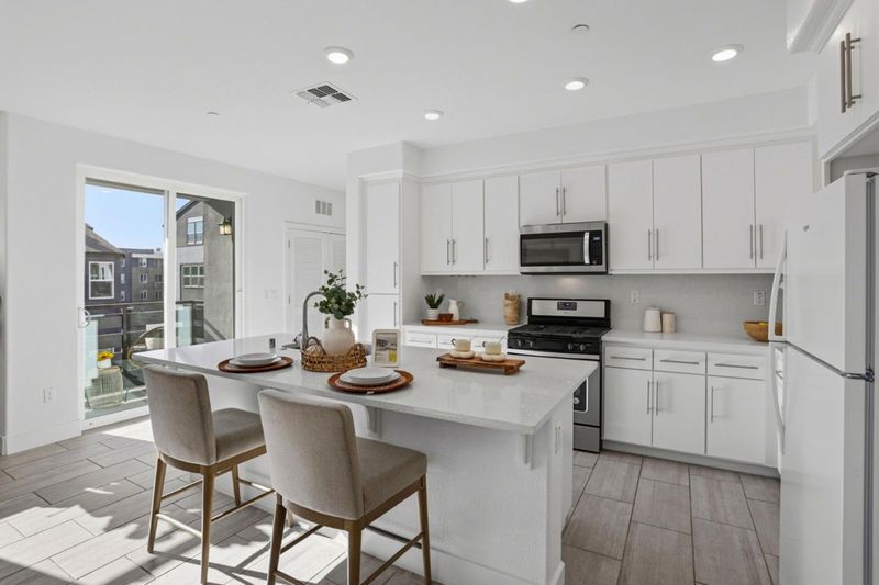Immaculate and impeccably maintained, this top floor corner unit townhome nestled a highly coveted location with stunning open views. It features abundant large picture windows that offer opulent soothing natural light and lush greenbelt views from most rooms. The open floor plan is decorated in contemporary neutral colors and trendy tile floors throughout. The spacious and functional kitchen is equipped with ample white cabinets, SS appliances, expansive quartz counters, and a large central island with a convenient breakfast bar. Step out onto the intimate deck from both the living room, seamlessly blending indoor and outdoor living. The generous master suite includes a lavish ensuite bath with dual sink vanity, and a spacious walk-in closet. Separated laundry room in good size. Enjoy outdoor activities in the nearby Newbury Park. Community amenities include a BBQ/picnic area and a dog-friendly park. Convenient location: short commute to downtown San Jose, Japantown, and shopping centers like Costco, Ranch 99, and H-Mart, easy access to BART, VTA, freeways 101/680, and within walking distance to Google and Meta shuttle stops.