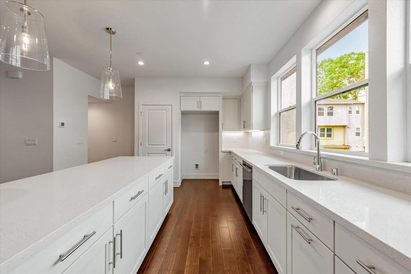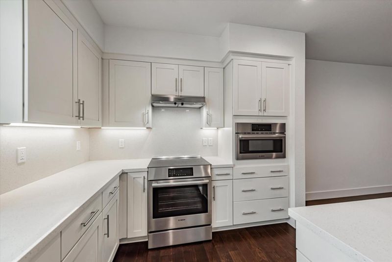 - Countertop - Quartz, Dishwasher, Exhaust Fan, Garbage Disposal, Hookups - Ice Maker, Microwave, Oven Range - Electric