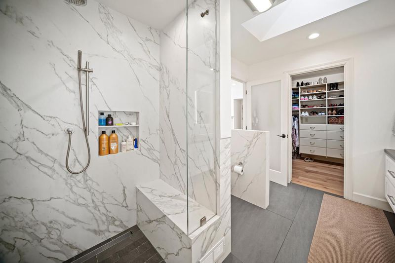 - Double Sinks, Dual Flush Toilet, Full on Ground Floor, Primary - Stall Shower(s), Skylight, Stall Shower, Stone, Tile, Updated Bath