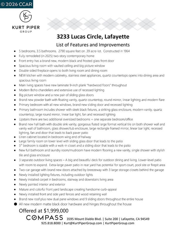 Completely remodeled in 2025, this beautifully transformed two-story contemporary home blends mid-century character with sleek, modern finishes. Located in Lafayette’s coveted Burton Valley neighborhood, you’ll love the privacy of this serene hillside setting. The light-filled interior offers a flexible floor plan anchored by a striking double-sided fireplace and a stunning open-concept kitchen that flows seamlessly into expansive living and dining spaces. Nine brand-new sliding glass doors flood the home with natural light and frame picturesque hillside views from nearly every room. The lower level provides exceptional versatility—ideal as a teen retreat, private guest suite, or quiet work-from-home sanctuary. Designed for effortless indoor-outdoor living, enjoy a spacious upper deck, lower-level patio, and an expansive rear yard with an oversized paver patio—perfect for entertaining or relaxing. Ideally located near Lafayette’s beloved regional trail, top-rated schools, vibrant downtown Lafayette, Walnut Creek, regional parks, Highway 24, and easy access to Oakland and San Francisco.Tell a friend — this is Burton Valley living at its finest