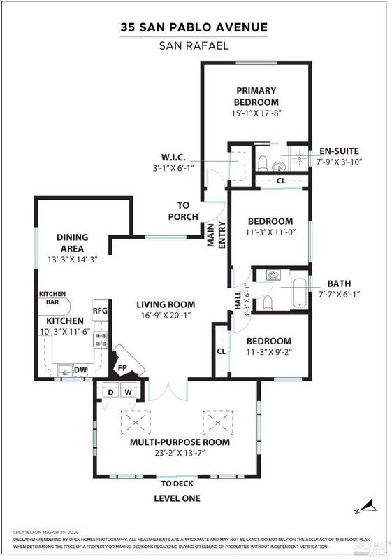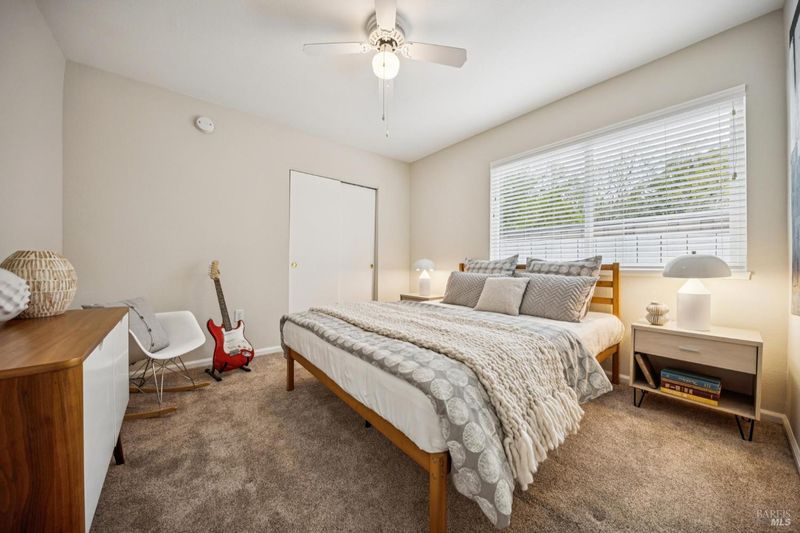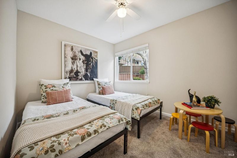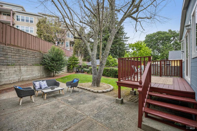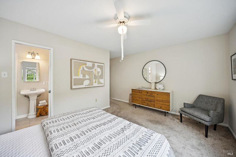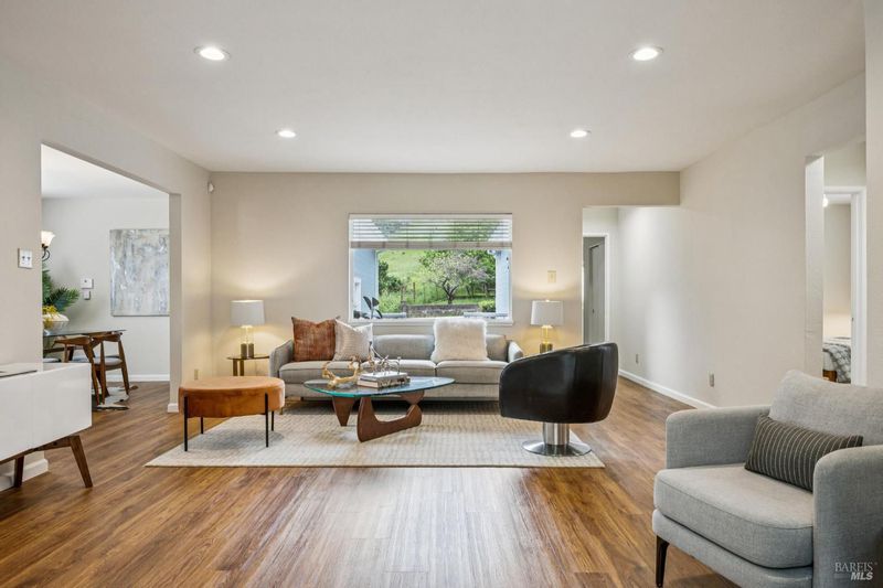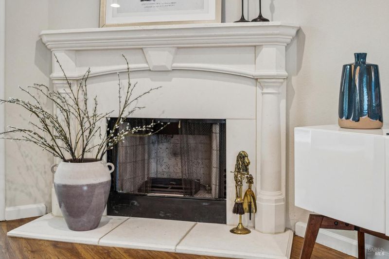 1940s Bungalow in the desirable Santa Venetia neighborhood near the Civic Center, offering a peaceful setting with timeless curb appeal. A lush, manicured front lawn framed by ivy and a classic white picket fence leads to a welcoming front porch, perfect for enjoying the quiet surroundings. The formal living room features a fireplace with decorative mantle and flows into a bright sunroom with skylights, creating a versatile space for relaxing or working from home. A laundry closet with washer and dryer hookups is conveniently located within the sunroom. Sliding glass doors open to a rear deck and the expansive backyard, creating an easy indoor-outdoor connection. The dining area connects to a well-appointed kitchen with stainless steel appliances including a gas range, dishwasher, refrigerator, hood fan, and ample cabinetry. Large windows frame views of the garden and fill the space with natural light. Down the hall are three bedrooms, including a spacious primary suite overlooking the front garden with an en-suite bath. Two additional bedrooms are similar in size, each with ceiling fans. The hallway bath includes a shower-over-tub and extended vanity for additional storage. Updated light fixtures add a modern touch throughout. The deep backyard offers a private retreat with mature landscaping, lemon trees and a storage shed, with ample space for entertaining, gardening, or relaxation. Additional features include a one-car garage with storage and a quiet location, close to parks, the Civic Center, and convenient commute access.