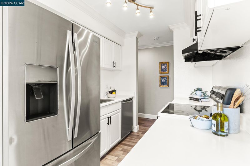 Modern Sophistication at 1133 Meadow Lane. This top-floor residence in a secure gated community offers a seamless blend of style and transit-oriented convenience. The light-filled interior is defined by contemporary wide-plank flooring, recessed lighting, and elegant crown molding. An expansive sliding glass door opens to a private balcony, offering neighborhood views and effortless indoor-outdoor flow. The primary suite features a convenient ensuite half-bath with updated fixtures. Resort-style amenities include a community pool and laundry facilities in every building. Perfectly positioned for a modern lifestyle, this home is minutes from BART, I-680, and the premier dining, cinema, and shopping at The Veranda and Todos Santos Plaza. Experience elevated living with unparalleled access to the best of Concord.