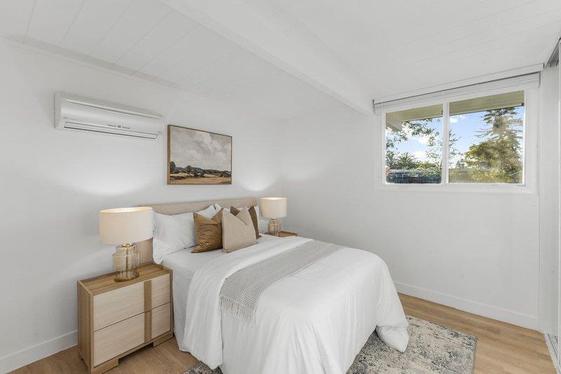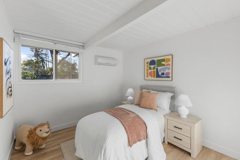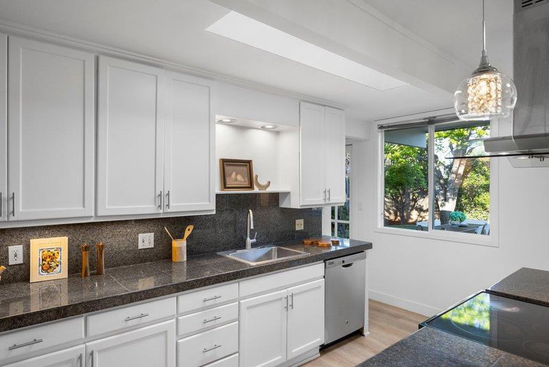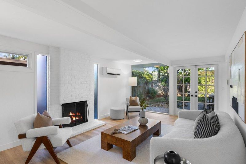 Beautifully remodeled Eichler in the highly desirable Panama Park neighborhood, showcasing classic mid-mod architecture with walls of glass that seamlessly connect indoor and outdoor living and fill the home with natural light. Recent upgrades include LVT flooring, designer paint, updated lighting, heat pumps, dual-pane glass, and remodeled kitchen and baths. The stylish kitchen features granite countertops, custom cabinetry, s/s appliances, a skylight, and an island open to the dining area, perfect for entertaining. The living room offers dramatic floor-to-ceiling windows and a signature brick fireplace & french doors to patio. Eichler details include tongue-and-groove ceilings and multiple skylights, complemented by energy-efficient mini-split systems. The spacious primary suite features a walk-in closet and remodeled bath, while the hall bath has been updated with a newly tiled shower. Indoor laundry adds convenience. Professionally landscaped yard with interlocking brick hardscape and drought-tolerant planting plus classic indoor-outdoor California living. Prime location near Panama and Ortega Parks, with easy access to shopping, dining, Town Center, tech campuses Apple, Google & 280, 237 & 85. Top Cupertino schools: Stocklmeir Elementary, Cupertino Middle, and Fremont High.