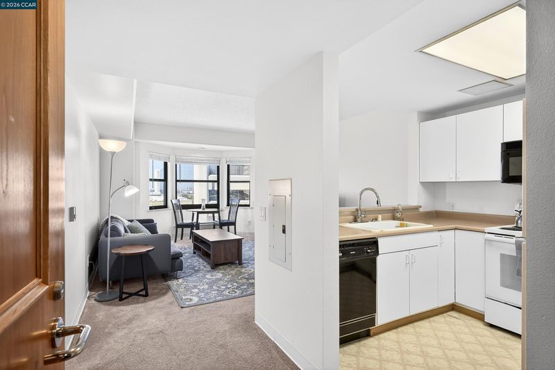 This beautifully updated 1-bedroom, 1-bath condo offers 615 square feet of bright, functional space in a well-maintained 1993 high-rise. This unit is well maintained and move-in ready at an exceptional price! Large windows fill the unit with natural light and offer views of the city. The open living, dining, and kitchen layout creates a seamless flow, while the generously sized bedroom provides ample space and storage. Enjoy the convenience of one secure, assigned garage parking space. Building amenities include elevators, laundry facilities, a rooftop garden, courtyard, and ground-floor conveniences such as a bank, restaurants, library, and health center. Just steps to BART, shopping, dining, and more... this is a rare opportunity to own an affordable, light-filled condo in one of Oakland’s most vibrant neighborhoods.