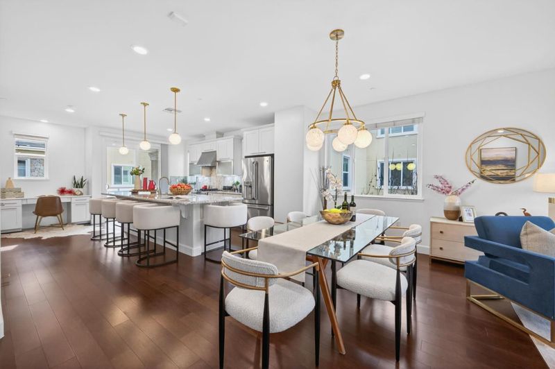 Discover elevated living at Avenue One. This turnkey, upgraded 4-bedroom, 3.5-bath end-unit townhome is just 9 years old and is located on the interior side of the community, offering a quieter setting away from freeway exposure. The sought-after floor plan features the community's largest kitchen island, paired with an expansive pantry. The light-filled open-concept living level flows from the kitchen to the living and dining areas and extends to a private balcony. Finishes include granite countertops, stainless steel appliances with a gas range, soft-close cabinetry, recessed lighting, custom fixtures, and built-in storage. A first-floor bedroom with a full bath offers flexibility for guests or a home office. Upstairs, the primary suite features dual vanities, a walk-in shower, a soaking tub, a walk-in closet, two additional bedrooms, and a side-by-side laundry. Additional highlights include wired AT&T Fiber internet, 3-zone HVAC with independent climate control including an Ecobee smart thermostat, smart-home features, and a two-car garage equipped with 240V EV-ready outlet. Residents enjoy a clubhouse with pool, spa, fitness center, BBQ areas, playground, gated dog park, nearby parks, and convenient access to Costco, Village Oaks, VTA Light Rail, and Highways 85 and 101.