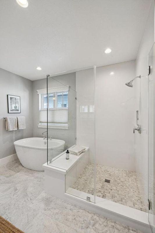 - Full on Ground Floor, Half on Ground Floor, Primary - Oversized Tub, Primary - Stall Shower(s), Showers over Tubs - 2+, Solid Surface, Stone, Tub in Primary Bedroom