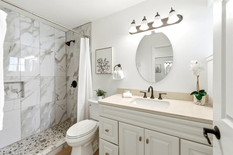 - Half on Ground Floor, Shower over Tub - 1, Stall Shower, Stone, Updated Bath